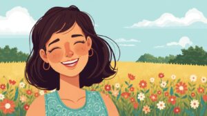 人生を前向きに生きる40代の女性、イラストで描いて_明るいかわいい笑顔、背景は花畑